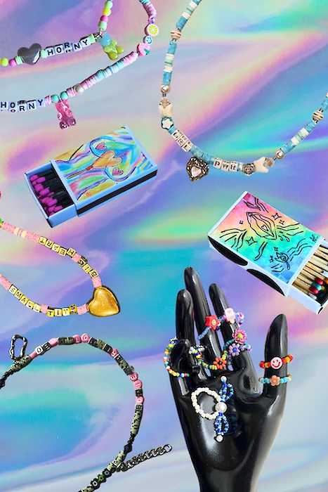 Y2K style necklaces with feminist and sex positive statements (also for disabled bodies!) and colourful matchboxes, perfect for lighting candles in a more intimate way, or for offering in place of a lighter when flirting outside a bar.