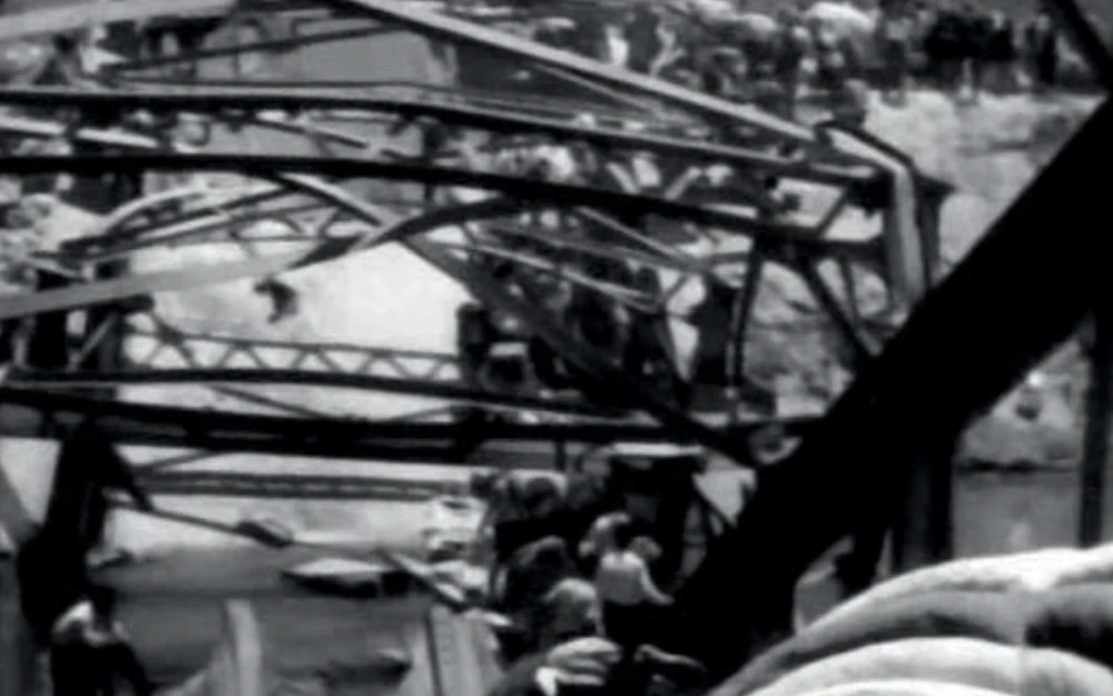 An image: a people crosses a broken bridge. Their flight across the remnants of the Allenby Bridge in June 1967 amidst the Six Day war is spurred by memories of the horrors of the 1948 Nakba. But rather than a memory, this latest crossing is now entering the eternal present, becoming a timeless celluloid incantation – part mantra, part curse. The 23 minute video ‘reclaims’ the bridge-crossing sequence from seven films made between 1967 and 1976 on the Palestinian struggle and resistance against the Zionist colonial erasure and seizure. Stripped of audio, slowed, and re-assembled the scenes permit the bridge crossers to reclaim their time and position.